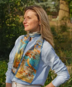 This luxurious long silk scarf is crafted from 100% natural Mulberry silk, renowned for its luminous sheen and smooth, soft texture. The design is double-layered and printed on both sides, bringing a touch of elegance to any outfit. Its luxurious softness makes it an ideal fabric for those with sensitive skin or who prefer natural fibres. The scarf is certified to OEKO‑TEX® Standard 100.
