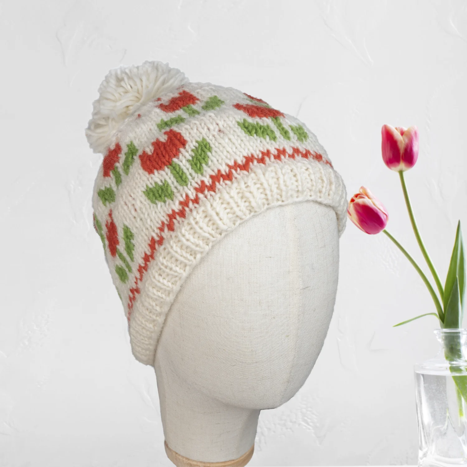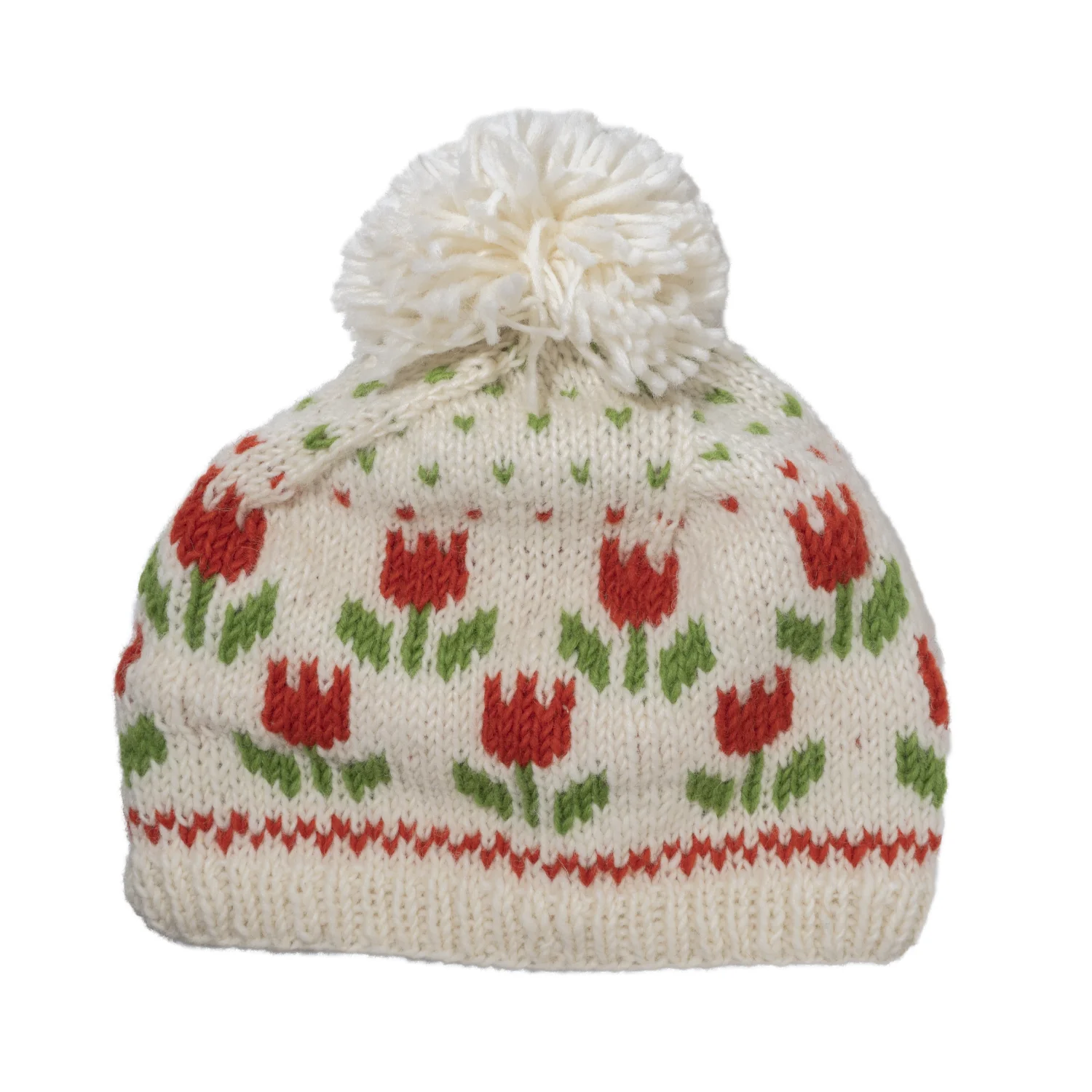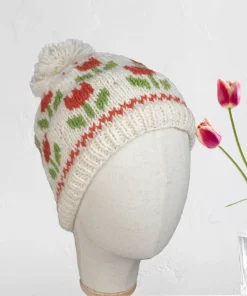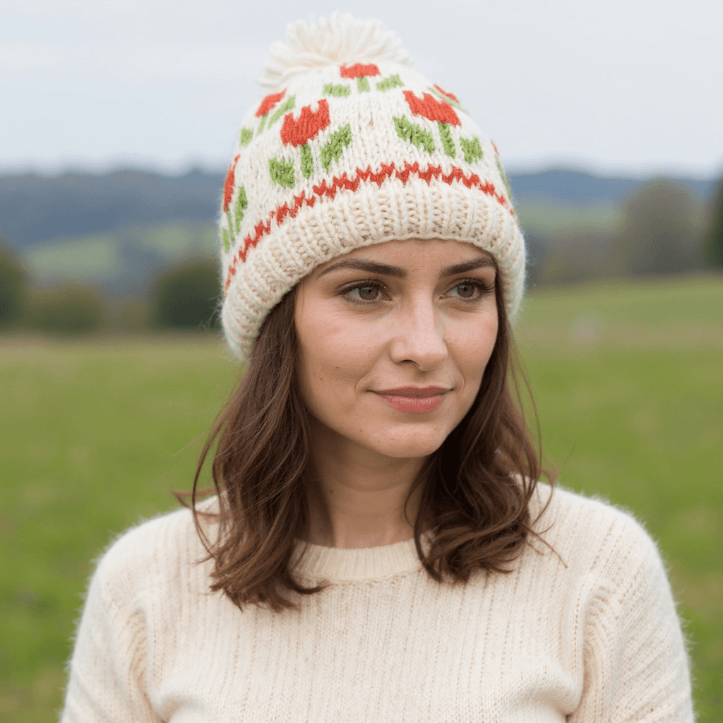 Stay warm and stylish with our Pure Fine Wool Bobble Beanie Forget Me Not design, hand-knitted by skilled artisan women using traditional techniques. The naturally breathable wool insulates and regulates body temperature more effectively than any synthetic material. Each hand-knitted hat reflects exceptional craftsmanship and a unique artisanal charm, making it an ideal Irish gift or to treat yourself.