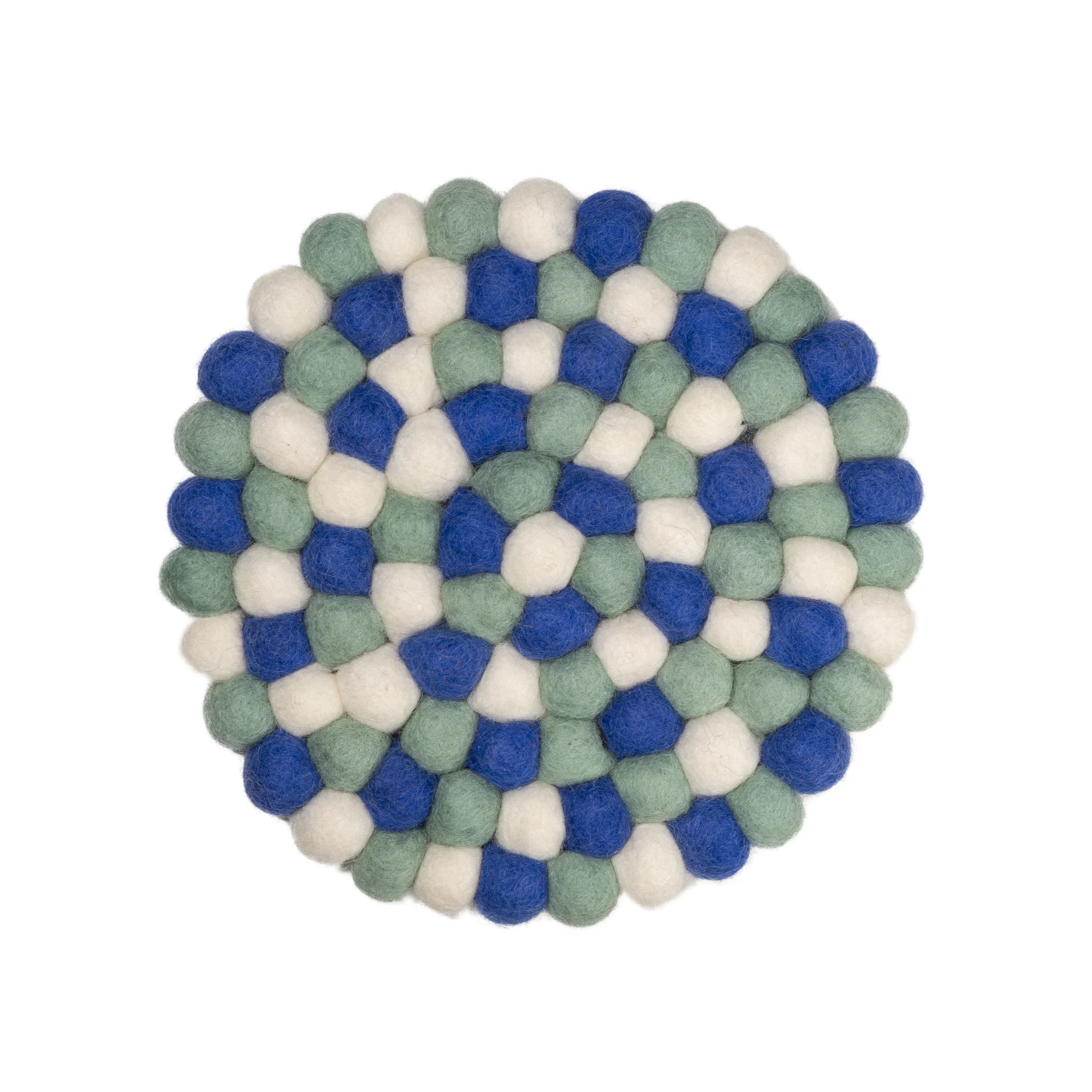 Add a pop of colour and texture to your table with this beautifully handcrafted wool felt ball placemat. Made from 100% natural wool, each felt ball is hand-made with care by skilled artisans, creating a striking blue, turquoise, and white pattern that brings warmth and charm to your home.