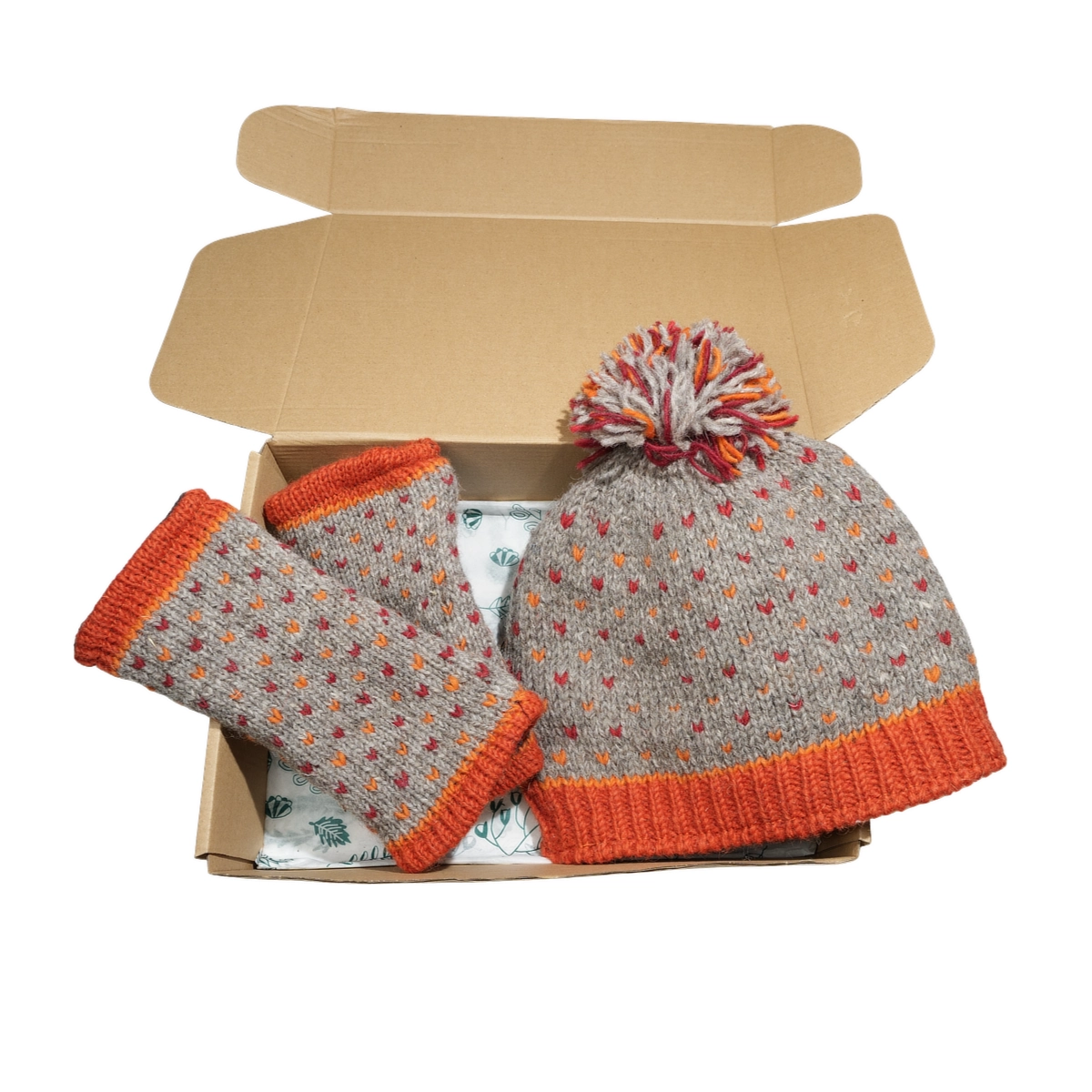 Pure Wool Hand Knitted Grey and Maroon Set RC08 Beanie and Handwarmers